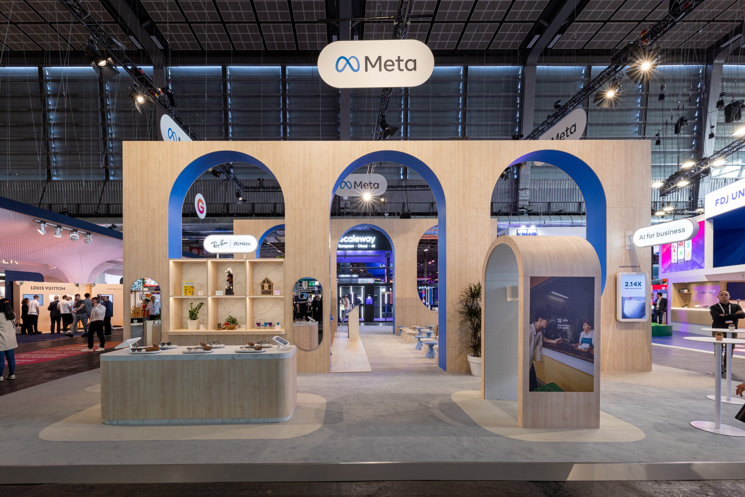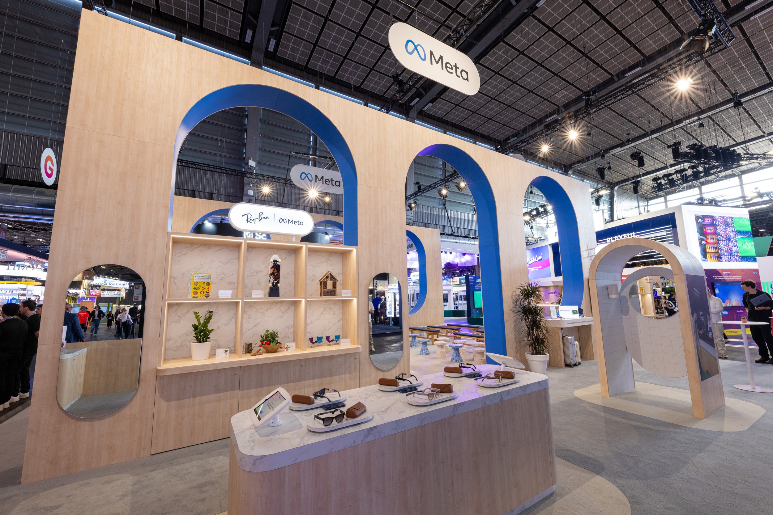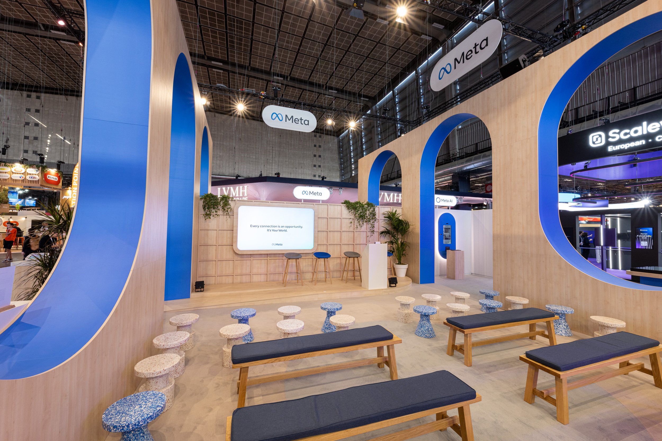 We combined open, inviting zones with more intimate demo areas to balance footfall with focus, using recycled materials and calm textures to contrast the chaos of VivaTech. The Atrium served as the epicenter, hosting over 30 speaker sessions. Around it, attendees interacted with Meta’s latest tools: from the custom Imagine Me activation to guided demos of FAIR, Quest 3 and Ray-Ban Meta. Every element was designed to educate, inspire and invite hands-on discovery, delivering a stand that was both deeply experiential and unmistakably Meta.
